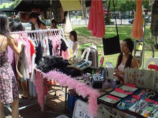 Last sat, I had my very first fleamarket stall @ Scape beside Cineleisure Orchard. This was organized by Lime Magazine and for a cheap rental of $20 per day, I would say the location and crowd was pretty good. Even though we were placed at the back of the market as my original location was taken by someone else, we still have a good flow of customers. Since this was my first time selling at a fleamarket, I am not sure what I need to prepare, but I brought along a clothes rack to hang those clothes I wanna sell, and some paperbags to pack the merchandise in. Many stalls were quite expert in this, some sell exotic t-shirts, accessories and even sandals. I had a lelong corner selling clothes @ $1ea. There were many browsers but few buyers..despite the hot weather...there were many pple that came and shop around. I was even interviewed by Channel V...not sure where its from though.